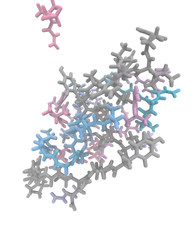 Here we can see the side by sides of shuffle and serial. AMPSA is the most clear difference due to its location in the config file. In serial, it has docked on the surface of the epitope and is surrounded by NIPAM and cross-linkers. However, when it gets shuffled, some are docked on the outside, which lowers its chances of contributing to the MIP.